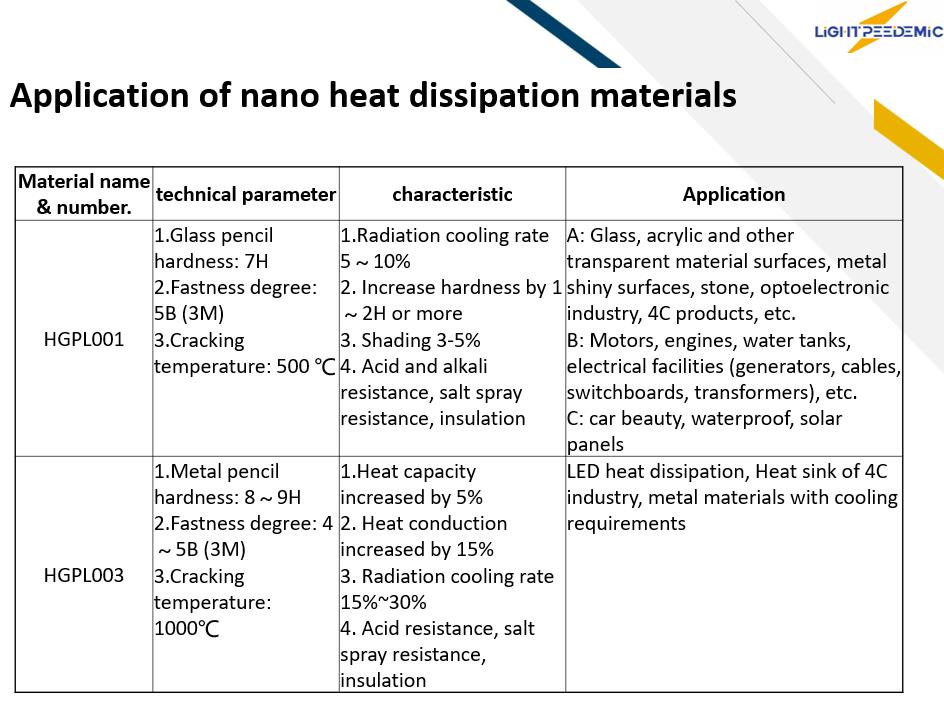 technology of contemporary diamond-like independent heat dissipation, so that the product is very different from those ordinary high temperature siliceous coatings in terms of performance, its unique structure makes them outperform other traditional heat sink materials in performance and can maintain excellent adhesion, and other properties include resistance to strong chemical attack and strong corrosion, high hardness and anti-violet.